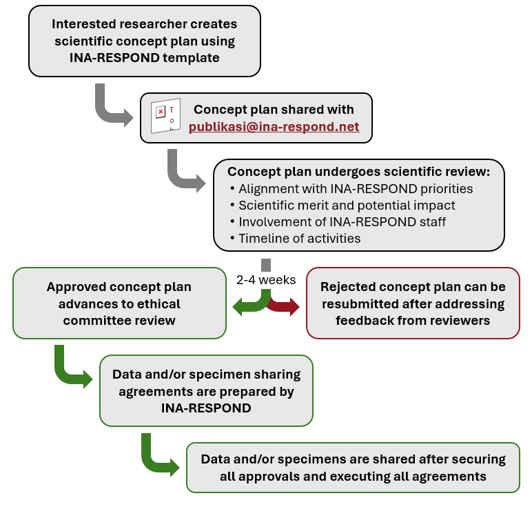 The researchers in INA-RESPOND welcome collaborations that use existing data and specimens collected as part of INA-RESPOND studies. All INA-RESPOND activities and resources are governed by an Executive Steering Committee of partnership leaders. Researchers interested in collaborating with INA-RESPOND should follow the review and approval process described in detail on the INA-RESPOND website. Further inquiries can be directed to publikasi@ina-respond.net.